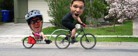 Patience and love! I also carry way more weight to even things out. Downhill, Chelsea zooms along. If there’s a headwind, we cruise at the same pace if she drafts off me. On big climbs, I wait at the top. :) When it gets REALLY steep, I ride ahead, then run back down and push her bike uphill. #supportivespouse