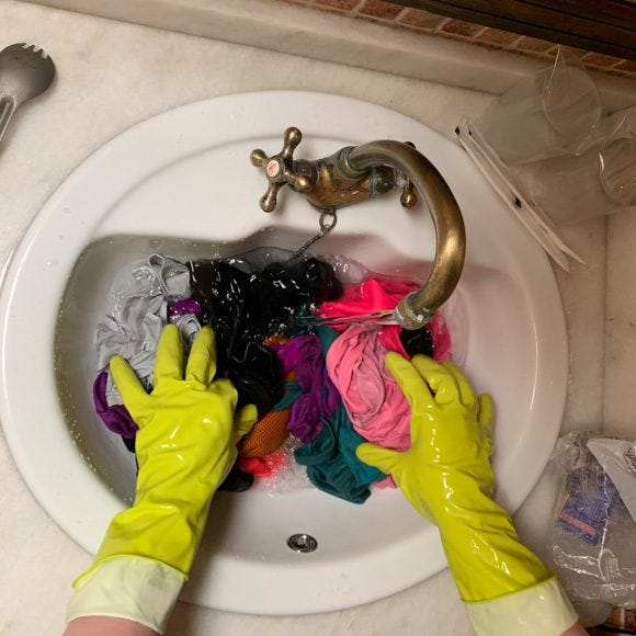 We travel with a high-tech, custom clothes washer: our hands. Whether in a folding camp sink or a hotel sink, we grind our clothes around for a few minutes with some soap and water, rinse things out, and hang them up. (Quick-dry everything!) If they aren’t dry the next morning, we “yardsale” them on our bike racks while we ride orrrr ride with a wet shirt for a bit. #keepingitclassy