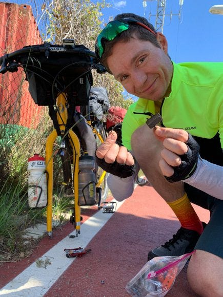 There's always something with this many miles on a bike! I put together a comprehensive kit and we're prepared for many mechanical issues (brakes, flat tires, spokes, derailleur adjustments, and broken racks). Beyond that, it's up to the kindness of strangers to get us to a bike shop!