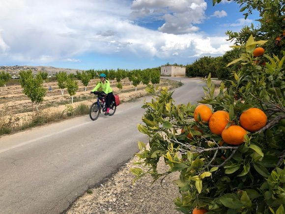 These days, I prefer to see less and (hopefully) experience more. Bike touring exposes us to the terrain, weather (good and bad), smells, sounds, people, animals and other facets of life that we’re insulated from while traveling by plane, train, bus or car. Bees buzzing in an orange grove or a pretty bird at a lunch spot come to mind from the last two days.