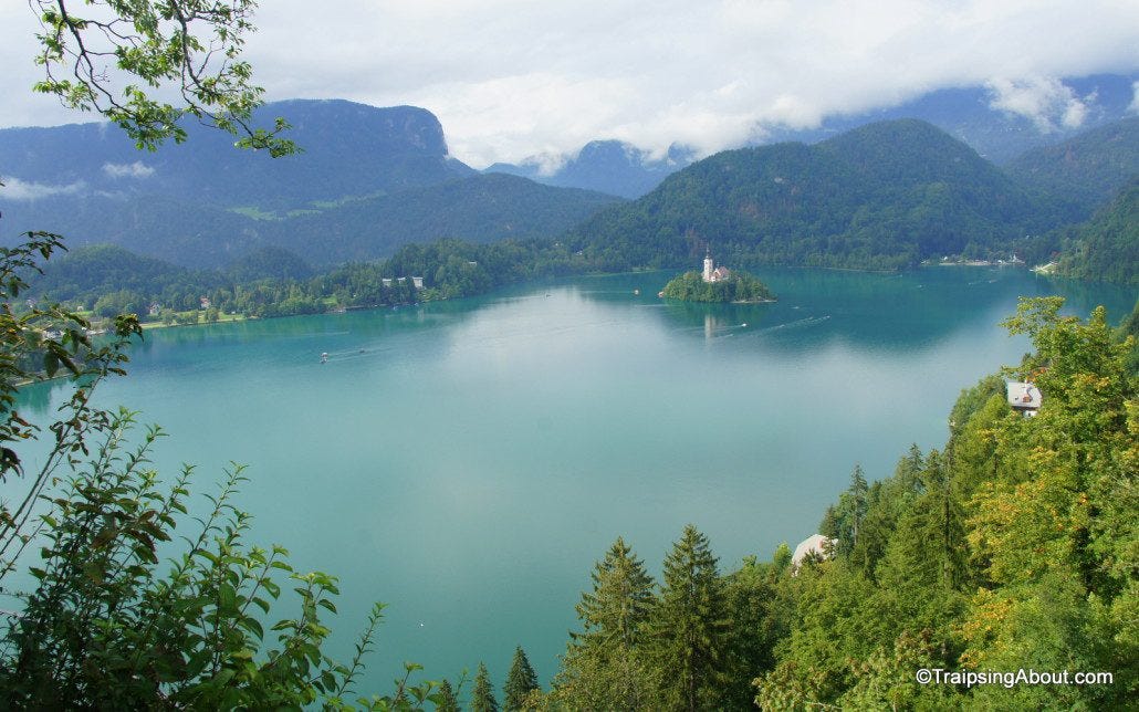 The idyllic Lake Bled and the famous church atop an island in the center.