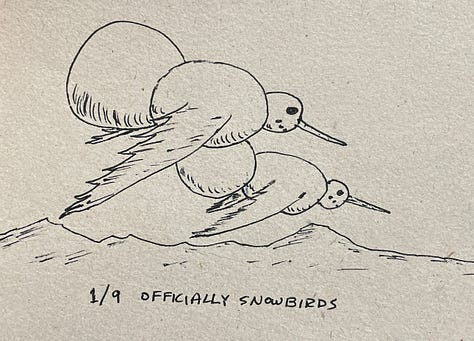 In fact, usually I aim to do them in less than 10 minutes, to not be perfect, to never crumple up failures. One take, snap text PING. Done. I’ve even switched to pen instead of pencil so that I commit to lines and can’t erase.