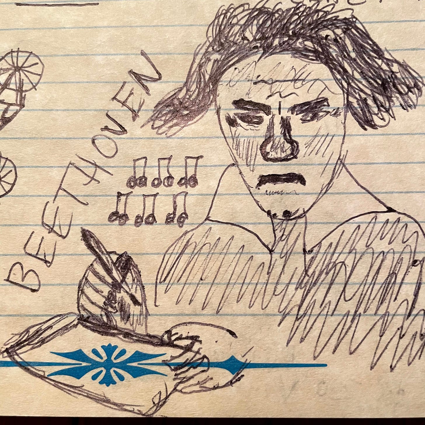 On a whim one evening, I sketched Beethoven and texted a pic to Eric, co-conspirator in many a fine adventure. He texted back a doodle of his own.