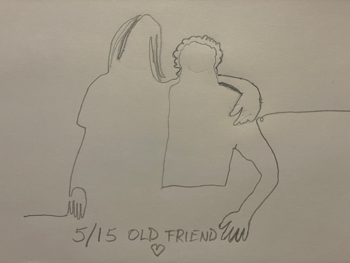 A half decade later, through work, travel, sickness, and assorted life complications, we’ve pinged one another with the day’s drawing. Sometimes they’re journal-y, a thing we did that day. Or sometimes they’re goofy, a play on words from a song or something we read.