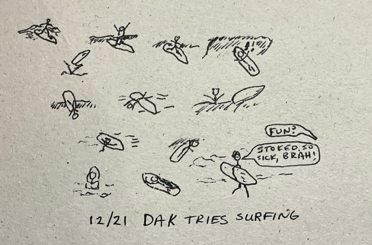 What a fun read, Dakota! The piece on surfing brought back so many memories...... that horrible feeling of being stuck in a washing machine underwater after a wipeout....the pain of saltwater up your nose....and the total elation when you figure out precisely how early to start your paddle to catch the wave at the bottom of the trough, even though it seems like the wave will crash right on top of you. Delicious! Definitely can't say I surfed/boogie boarded often- too chicken. I hated that washing machine feeling more than almost anything in the world! But I do vividly remember the feeling of catching a wave, and it's sooooooooo good that you understand how people get addicted to it! So happy you two got some ocean time in the midst of your grand adventure!!