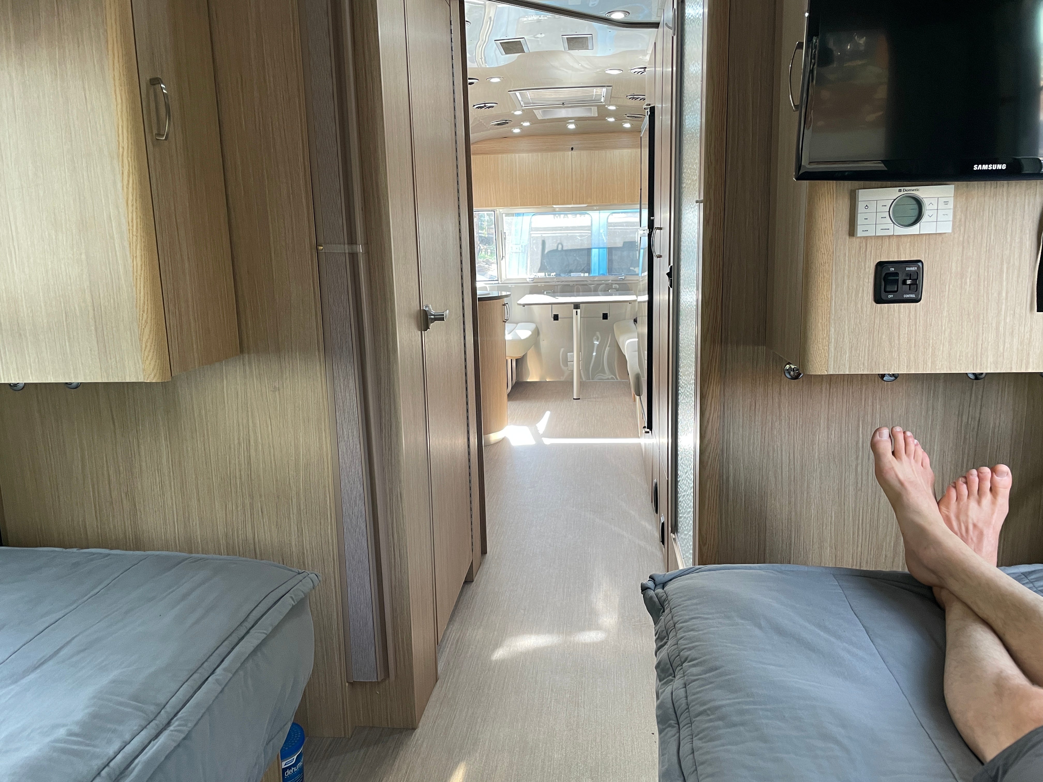 I want to play lots of piano, my fav hobby these days (apologies to my mountain bike). Yup, I’m still fired up on learning the music of old dead white guys from centuries ago. Hey, it lights me up…I’m going with it! There’s a perfect space to set up a piano between the twin beds up front in the Airstream.
