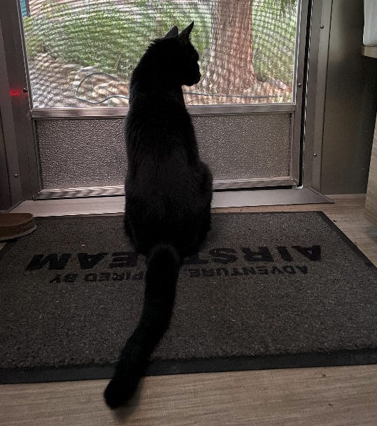 Yes, our 19 YO super-senior cat Oliver is coming with us. In fact, he’s already started meowing at the front door to our house because he loves to visit the Airstream. It’s super cute how he sits by the trailer screen door and sniffs the breeze.