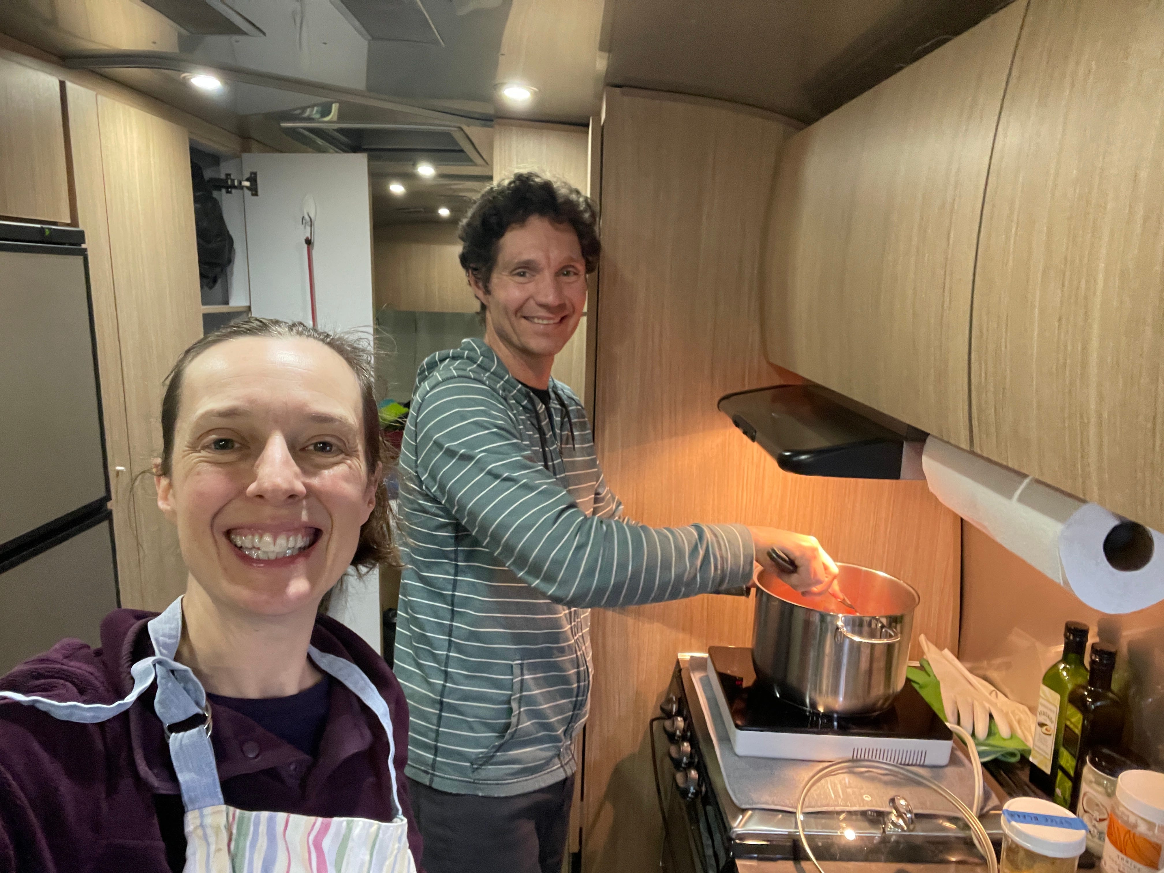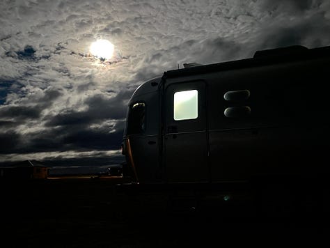 Also, we have running water and a toilet. Yep—the lap of luxury. Compared to the van, the Airstream feels like a tiny house: light pouring through big windows, a kitchen that actually invites us to cook, and just enough space to breathe. Vacuuming its 180 square feet only takes 3 minutes!